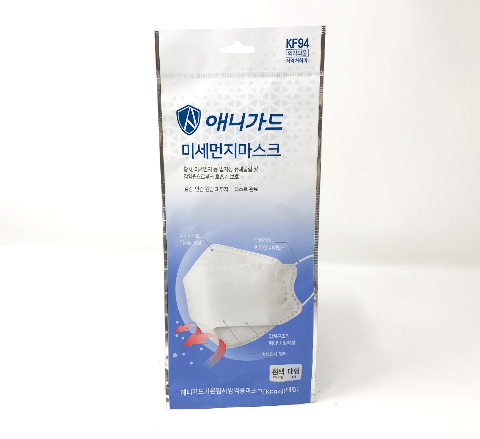 The ANYGUARD mask passed our particulate filtration efficiency machine test with a score of 98.07%. KF94 masks are boat-style and made in Korea, which has very strict production guidelines. All KF94 masks have ear loops instead of head straps or head ties.