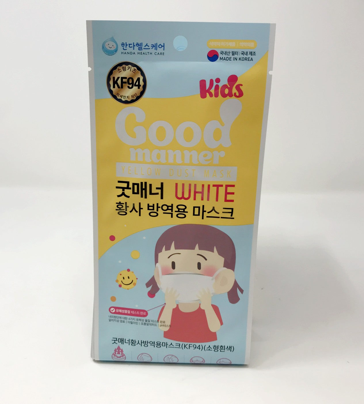 Made by Good Manner, these are boat-style KF94 kids masks. Like other KF94 masks, they must be made in Korea to be legitimate. We purchased a pack and were pleased with the test results, which gave Good Manner KIDS KF94 Face Mask a 99.67% filtration. Our testers also reported that the masks had no odor or smell, and had a good construction.