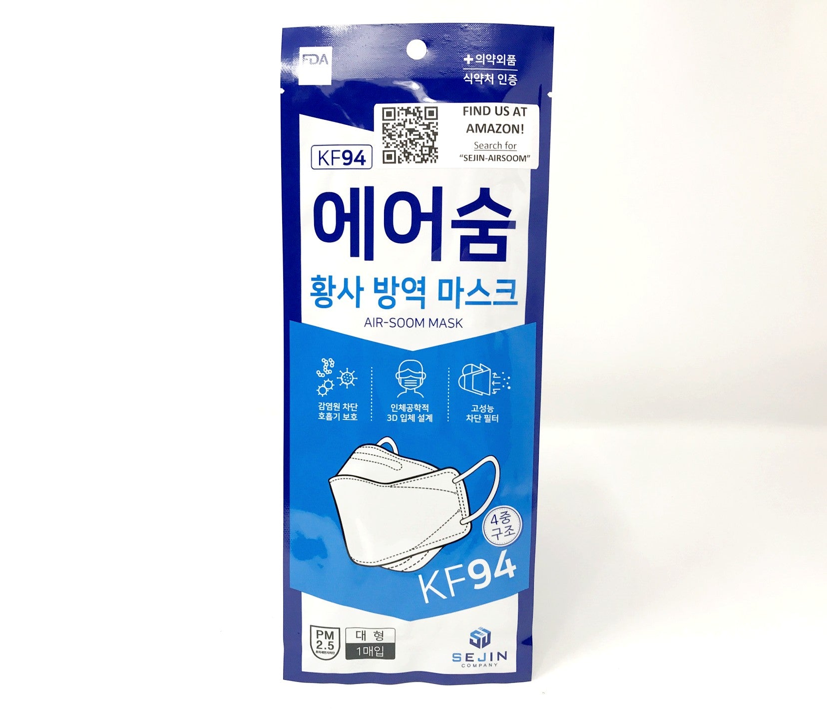 The SEJIN-AIRSOOM mask passed our particulate filtration efficiency machine test with a score of 98.98%. KF94 masks are boat-style and made in Korea, which has very strict production guidelines. All KF94 masks have ear loops instead of head straps or head ties.