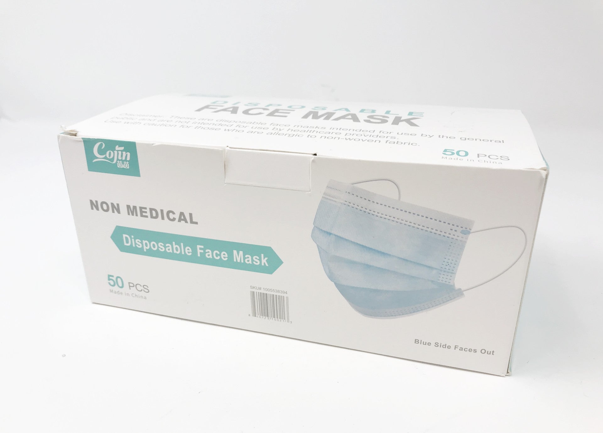 The Cojin disposable mask passed our particulate filtration efficiency machine test with a score of 97.11%. This blue surgical mask has ear loops instead of head straps or ties.