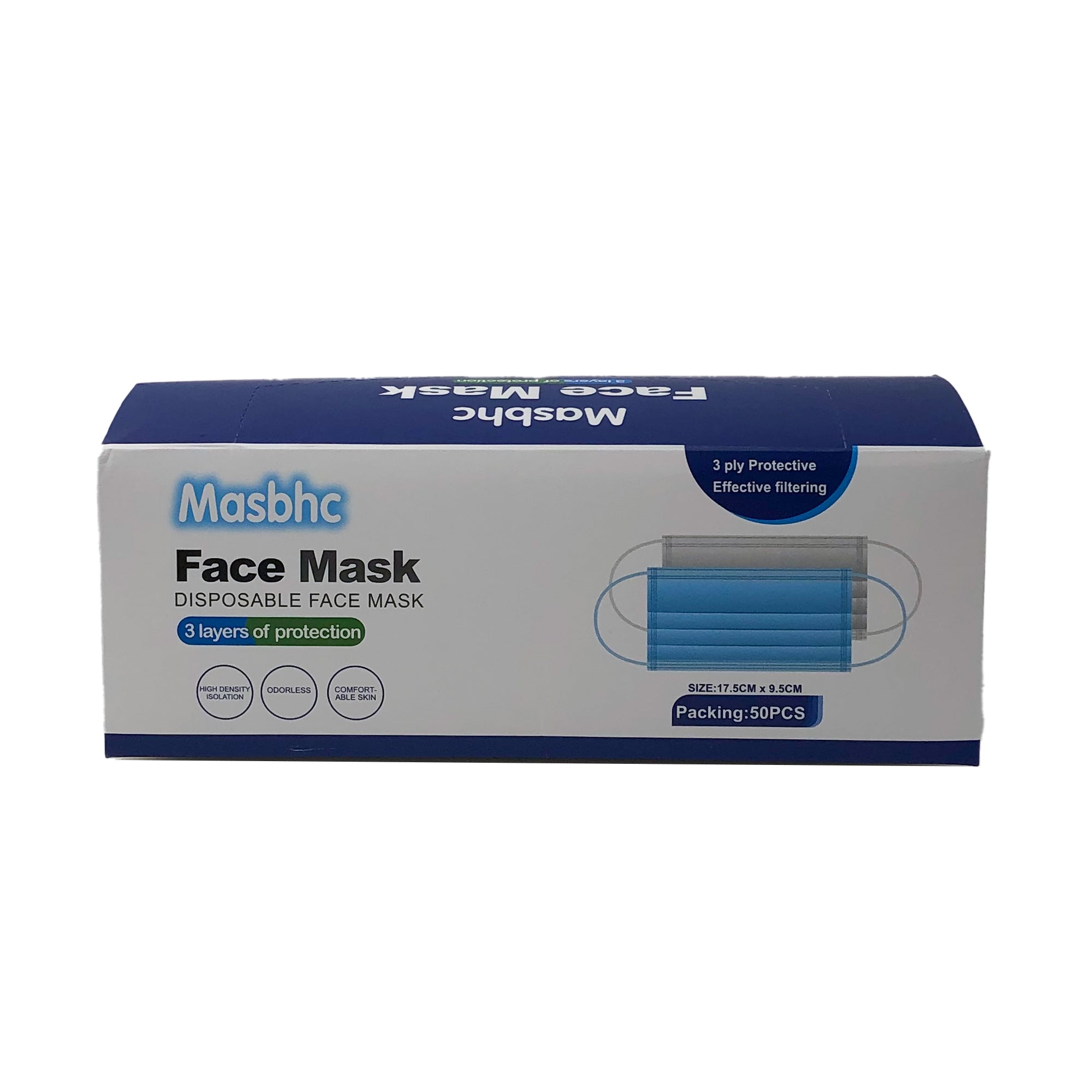 The Masbhc disposable mask passed our particulate filtration efficiency machine test with a score of 98.41%. This 3-ply blue surgical mask has ear loops vs. head straps.