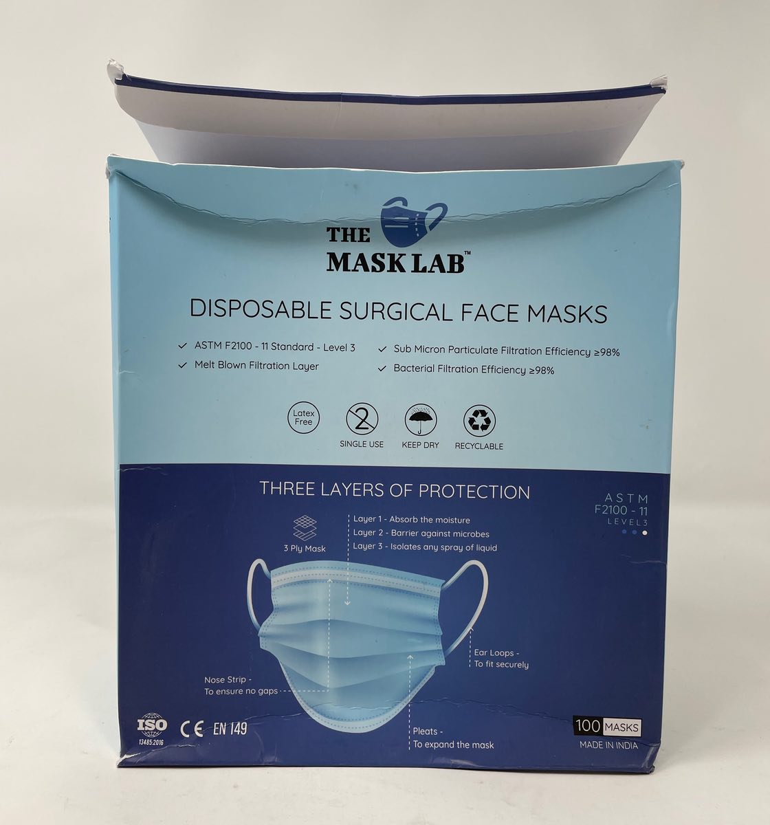 The Mask Lab disposable mask passed our particulate filtration efficiency machine test with a score of 93.04%. This 3-ply blue surgical mask has ear loops instead of head straps or ties.