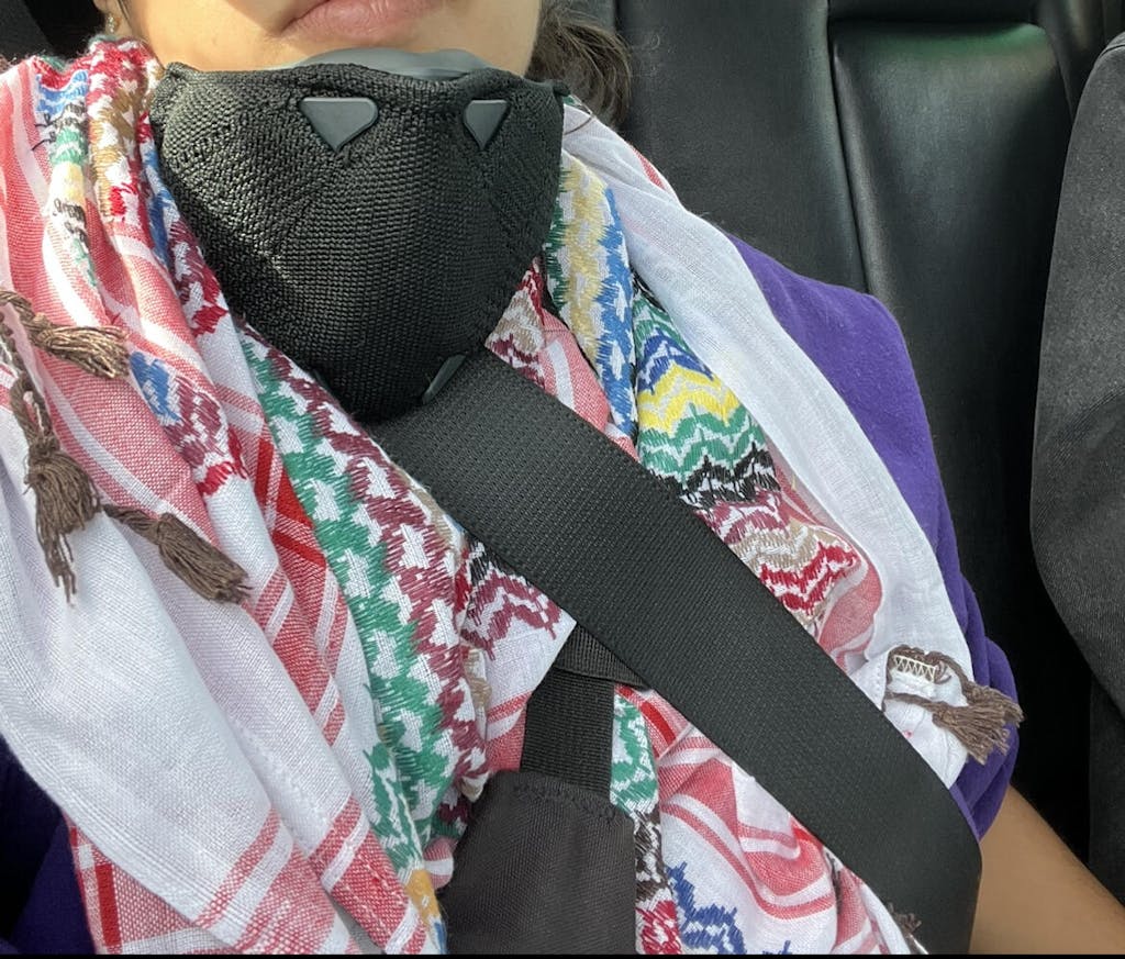An interchangeable, adjustable, and breathable textile component which secures the facepiece to the wearer. The strap design eliminates ear rashes caused by standard masks. Machine-washable.